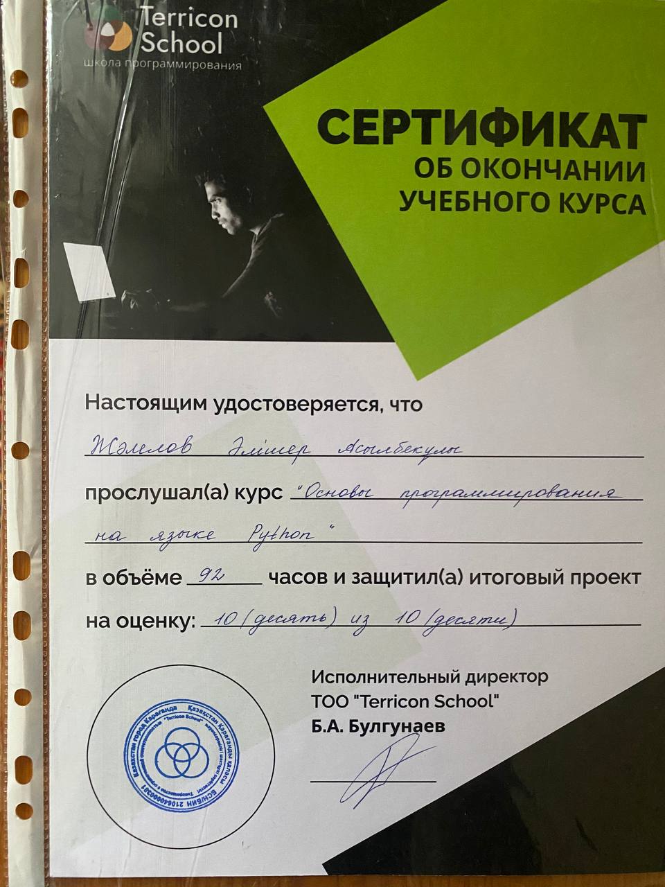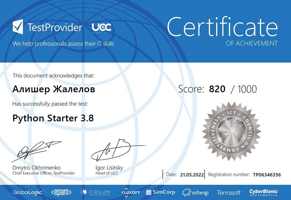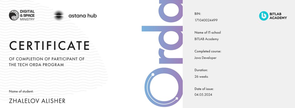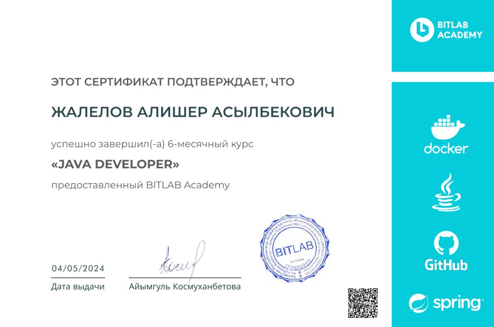 Меня зовут Алишер, проходил различные курсы на stepik(python, html, css, js), "основы программирования на языке Python" в Terricon School(сертификат имеется), также выигравал грант по программе TechOrda летом 2023 года на курс "Java Developer" длительностью в 6 месяцев в школе программирования BitLab(сертифкат имеется). Работал преподователем в различных школах по программирванию: codeforkids, Morrison academy, KiberOne, ШАГ, Школа программирования Anosoff в Росии, Smarteen.