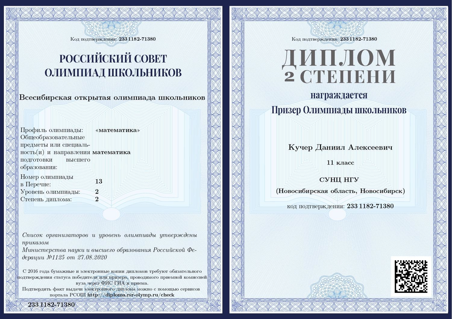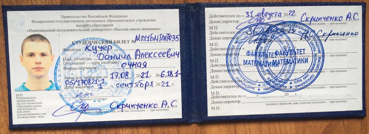 Я Даниил, учусь на 2-м курсе лучшего математического факультета в России – матфака Высшей Школы Экономики. В 10-11 классах становился призером и победителем многих перечневых олимпиад и этапов ВСОШ по математике. Дипломы олимпиад и студенческий билет смотрите в фотографиях.
