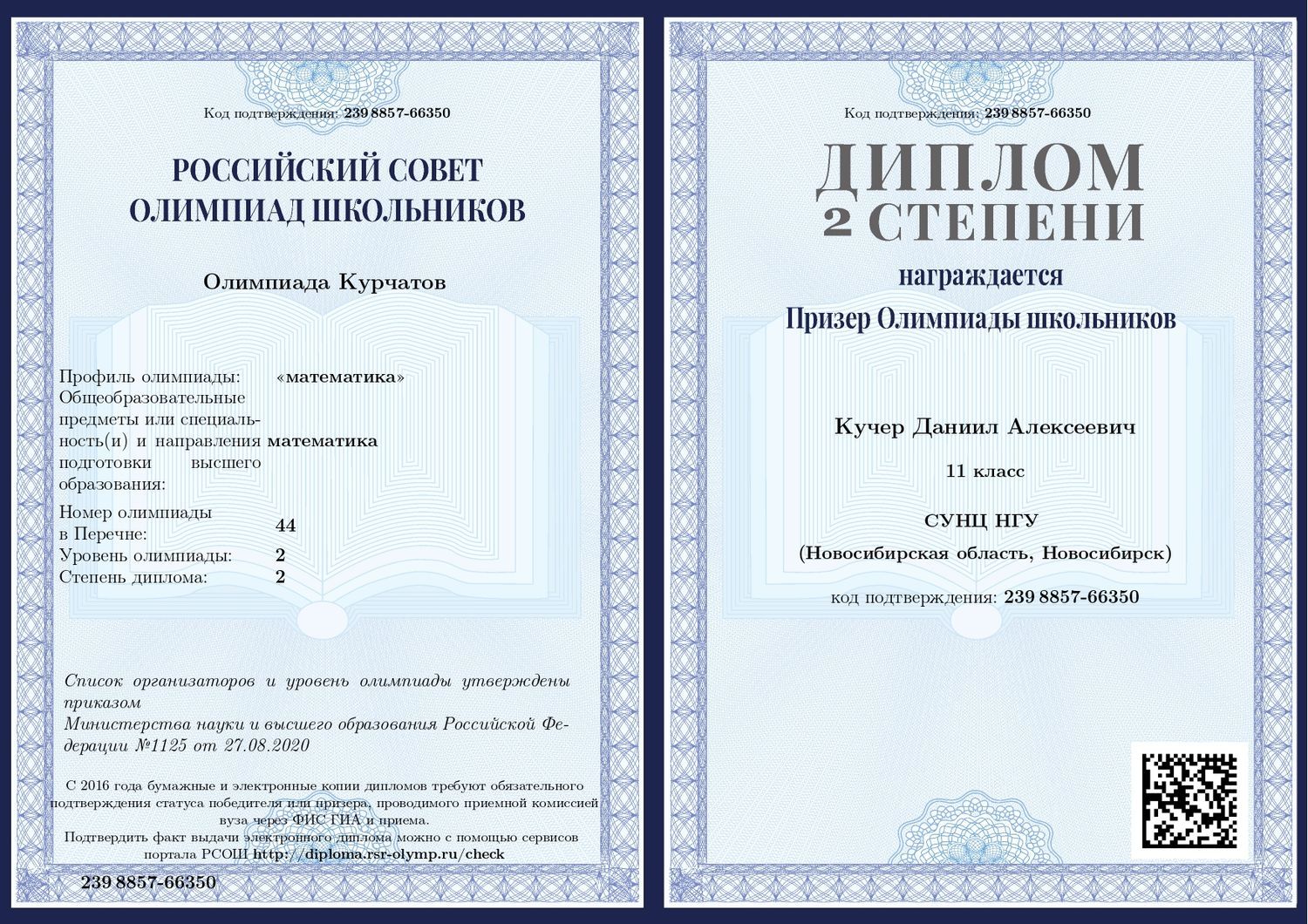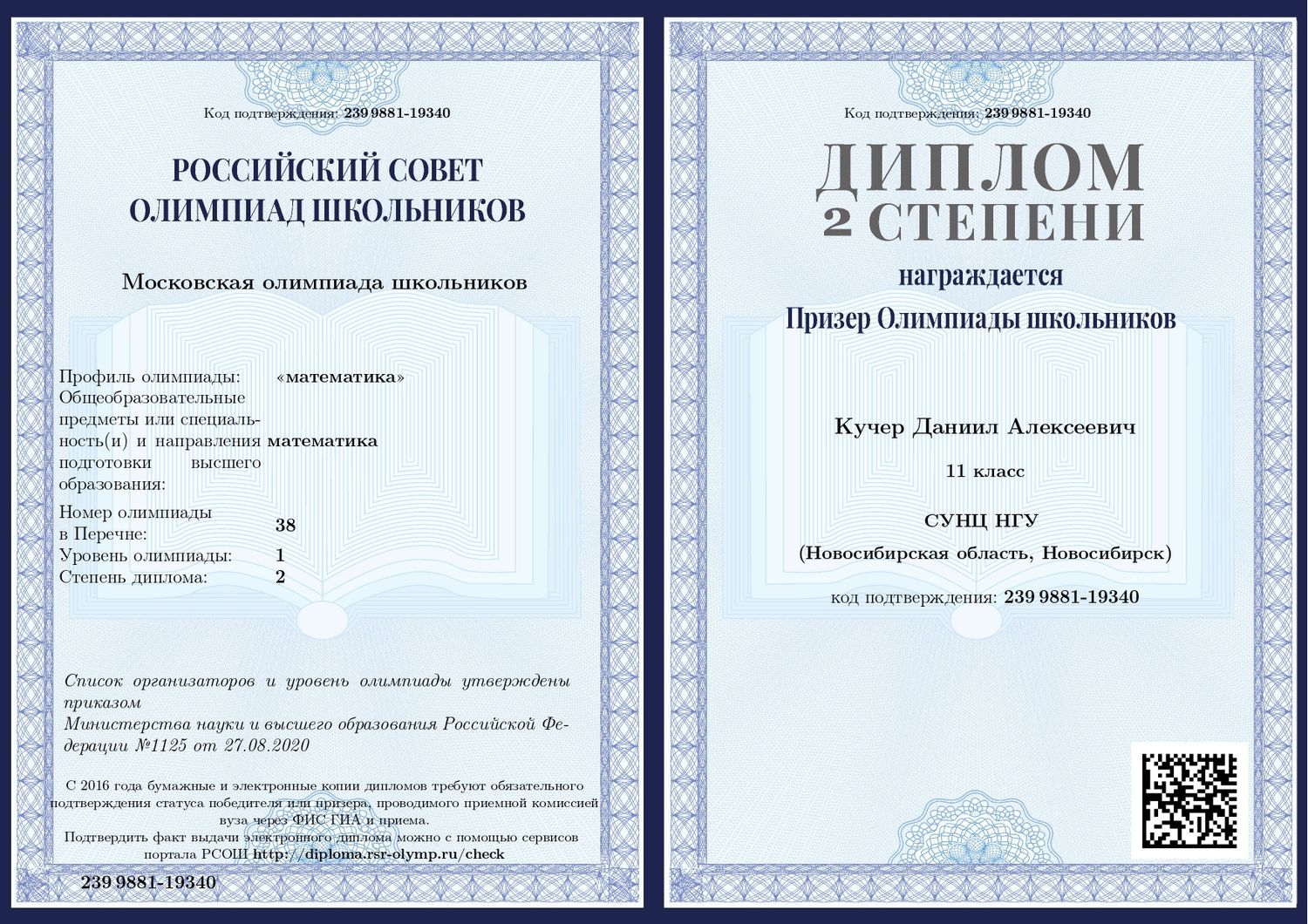 - Призер Московской математической олимпиады (1 уровень, 2 степень, 2021)