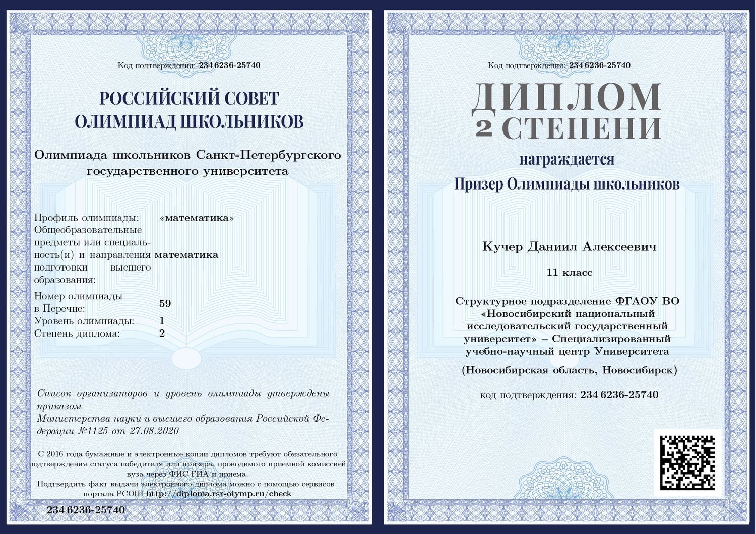 - Призер Олимпиады Санкт-Петербургского государственного университета (1 уровень, 2 степень, 2021)