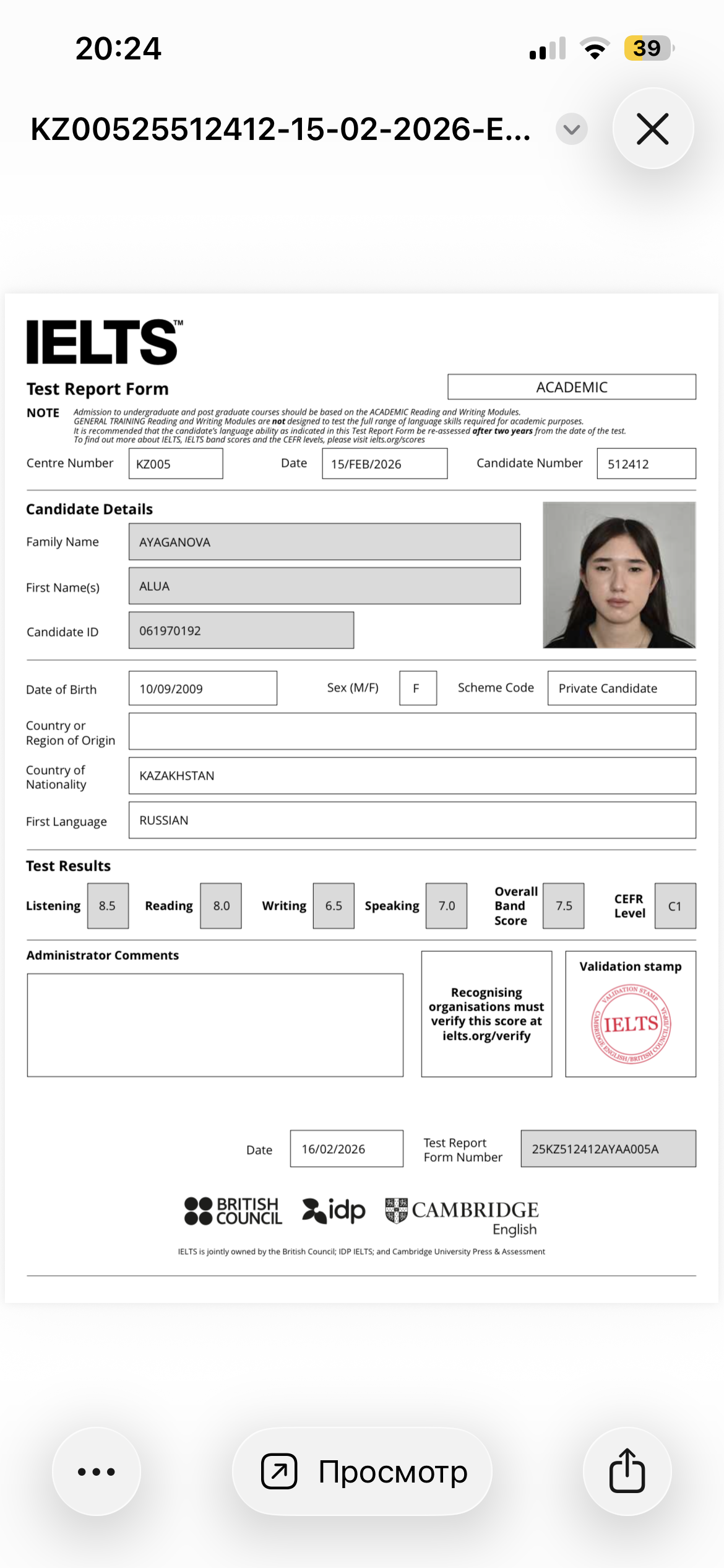 Обладательница айлтс 7.5 и сат 1480, уровень владения языка С1. Выпускница НИШ, сдала выпускные экзамены по математике и физике на A* (5+).