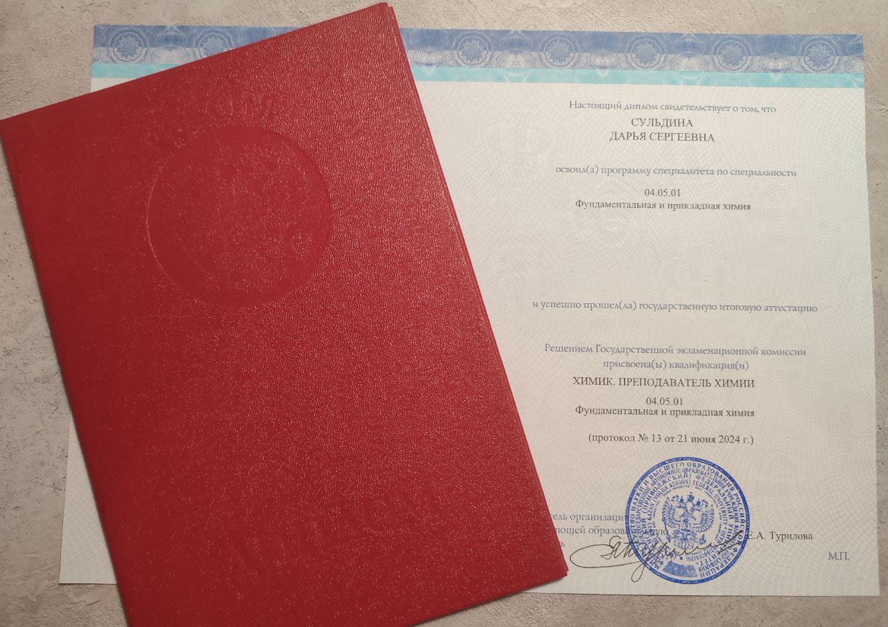 Добрый день! Меня зовут Дарья Сергеевна. Я преподаю химию уже 4 года и помогу Вам разобраться в химии легко и доступно!🍀 👩🎓Образование: выпускница Химического Института им. А. М. Бутлерова К(П)ФУ (Химик. Преподаватель химии) 👩🏫Работаю в Алматинском лицеи учителем химии