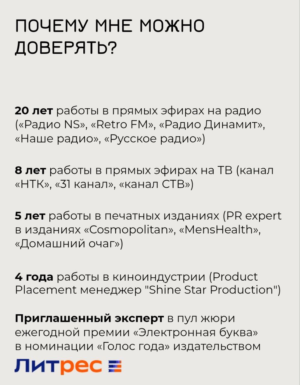 За плечами более 10 лет работы на радио и телевидении: прямые эфиры, редакторский пул и ситуации, где голос должен звучать уверенно с первого слова — без второго дубля. В мои авторские программы органично встроены элементы актёрского мастерства и профессиональной озвучки — с реальными кейсами, упражнениями и опытом из медиа.