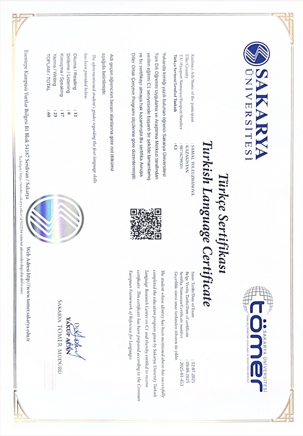 Меня зовут Самал. Я учусь в Турции в Sakarya Üniversitesi и год изучала турецкий язык на языковых курсах TÖMER при университете. Уровень турецкого языка C1,а так же есть сертификат.