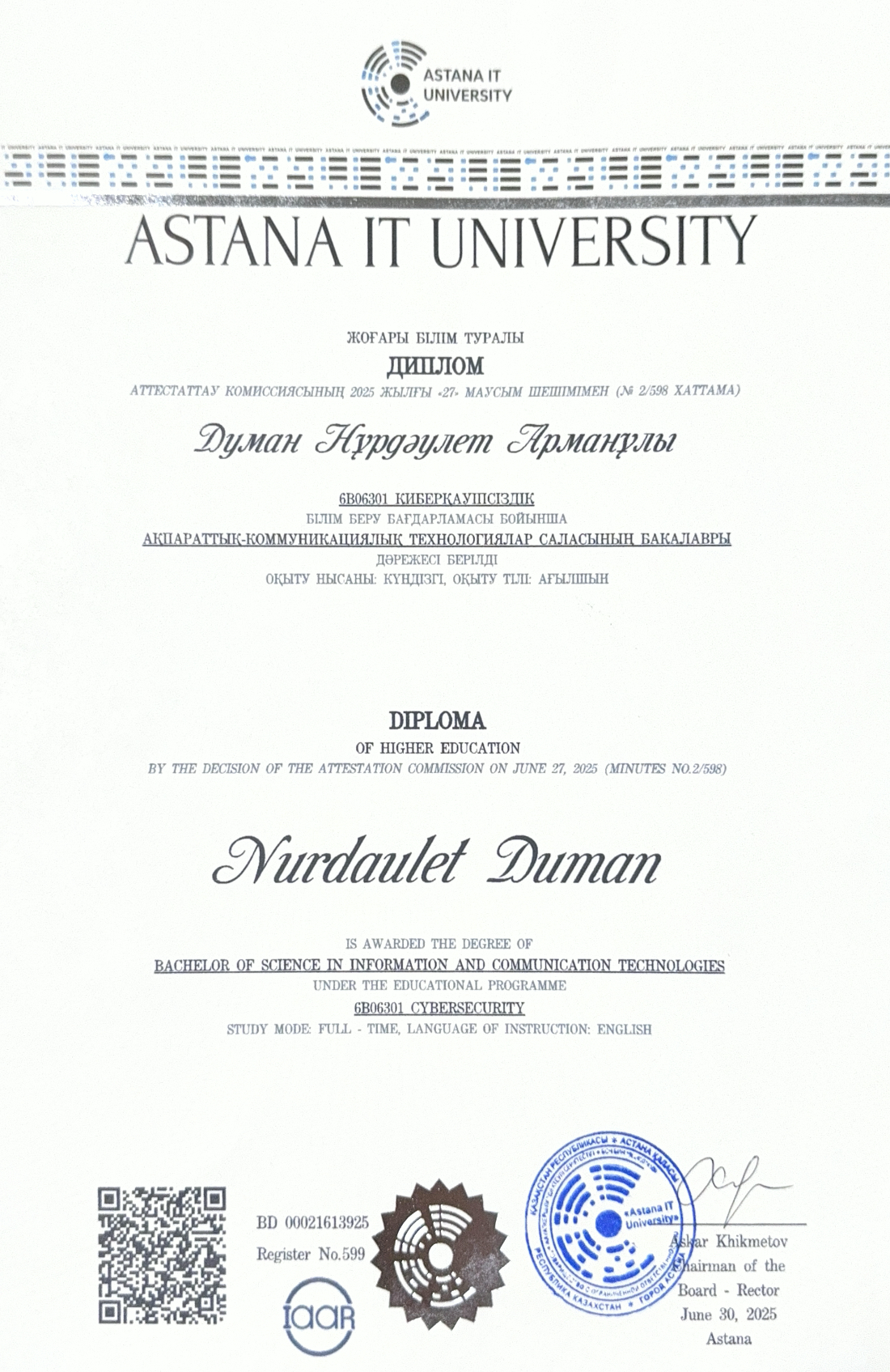 Выпускник школы для одаренных юношей «БИЛ»(КТЛ), Astana IT University. Сейчас учусь в Esil University