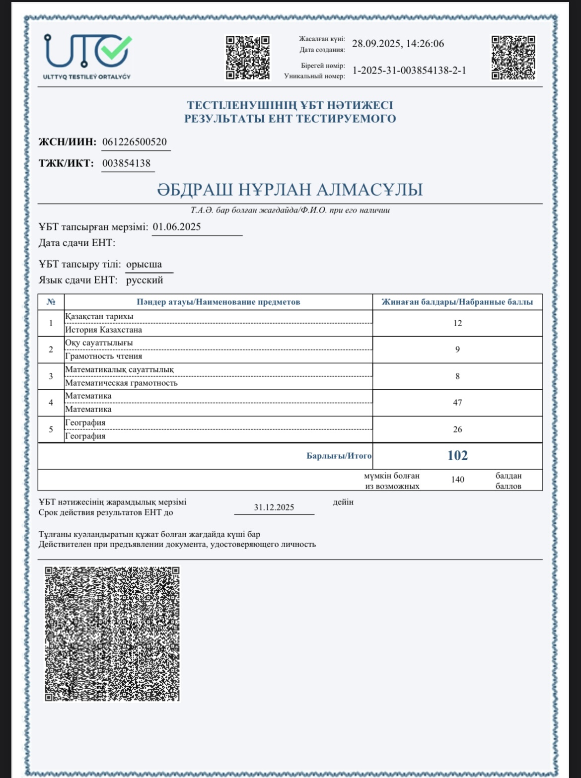Я учился в РФМШ 3 года, закончил Сулейман Демирел Лицей, учусь в Нархоз на профессии финансиста, набрал по ент по математике 47 баллов из 50, Ielts 7.0 score