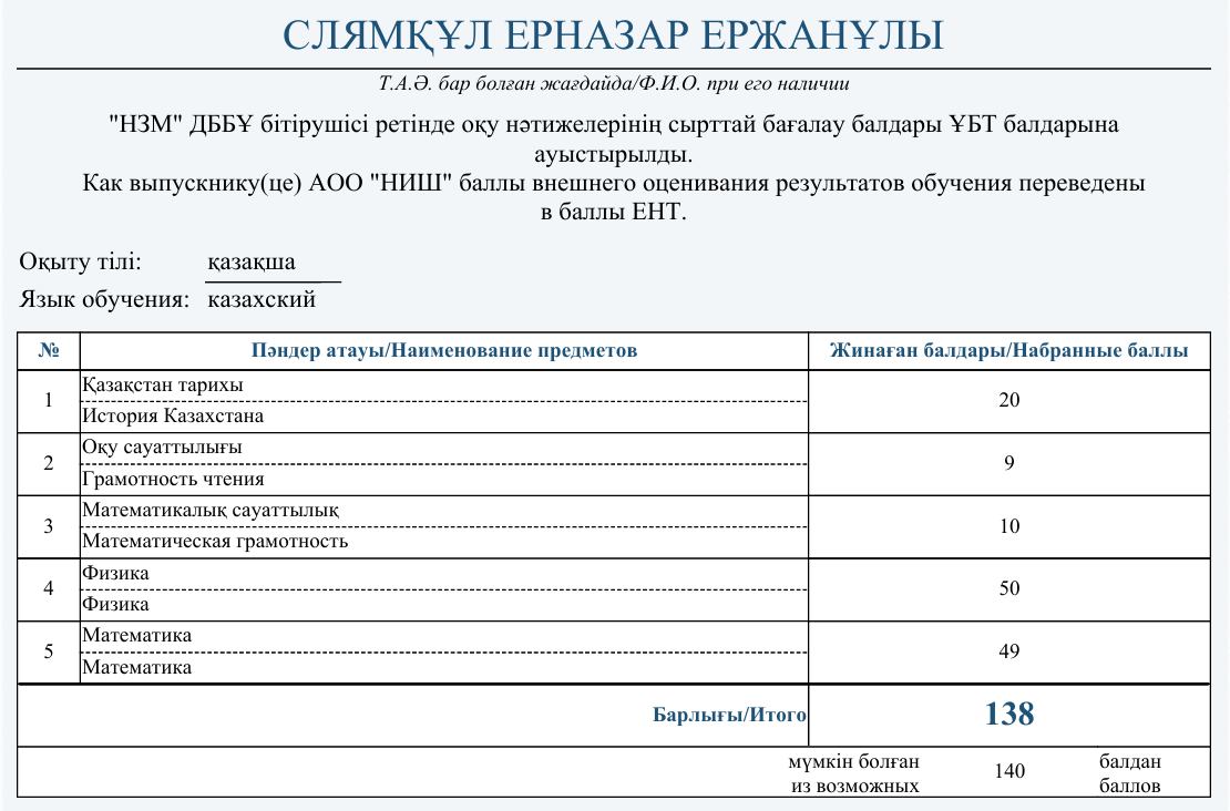 NUET (вступительный тест в Назарбаев Университет): 184/240, из них