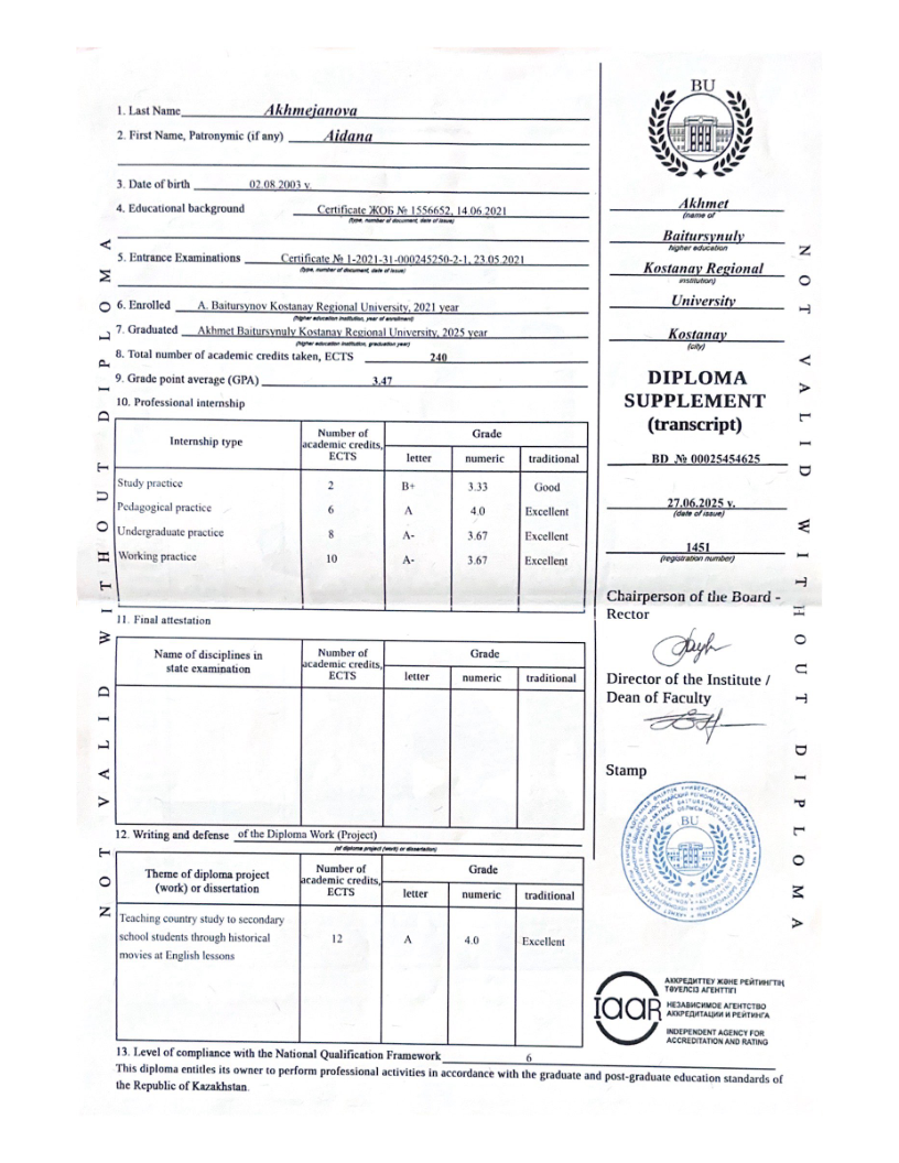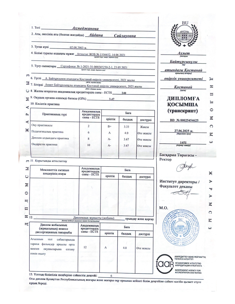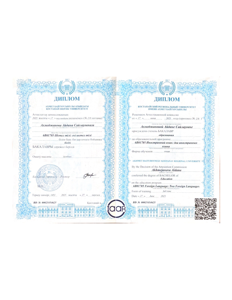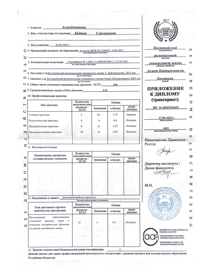 Я закончила Костанайский Региональный Университет имени Ахмета Байтұрсынұлы и имею степень бакалавра по специальности учитель английского языка, а также на данный момент, обучаюсь в магистратуре в Кокшетауском Университете имени Шокана Уалиханова по этой же специальности.