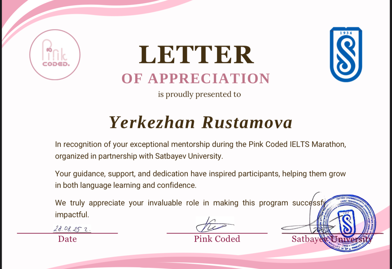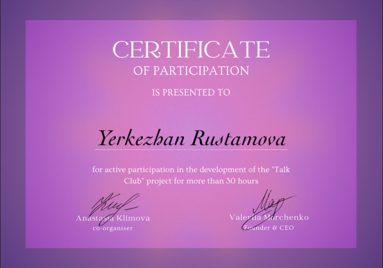 - Уровень английского С1 Advanced - Результат IELTS 7.5 - Участвовала в TedX конференциях на английском - Участвовала в Республиканском дебатном турнире на английском языке - Участвовала в интернациональных MUN конференциях - Преподавала в волонтерских проектах как Bilimdi Bolashaq, Inclusive academy, Talky club, IELTS Marathon PinkCoded