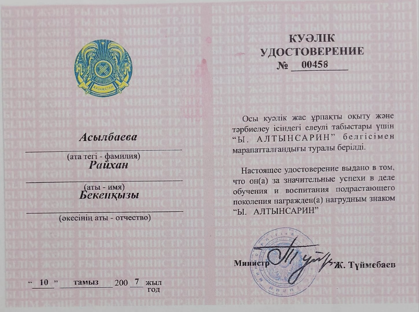 Мектепте жаңартылған бағдарлама бойынша сабақ бердім.Жоғары санатты зерттеуші-педагогпын.АКТ ны жақсы меңгергенмін.Алтынсарин медалінің иегерімін. Преподавала в школе по обновлённой программе. Я высококвалифицированный преподаватель-исследователь. Владею ИКТ. Лауреат медали Алтынсарина.