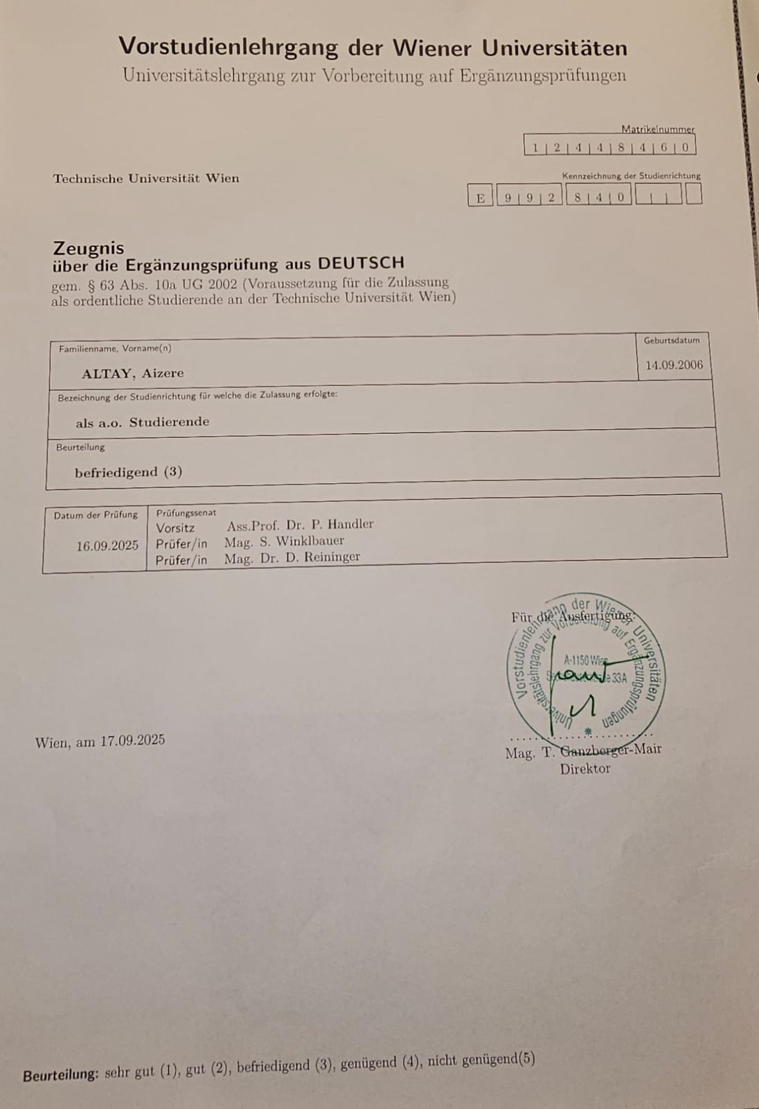 Сдала экзамены: IELTS 7.0, Geothe Zertifikat B1, NUET 155, EPD 3 (Языковой экзамен по немецкому на С1 при университетах Вены).