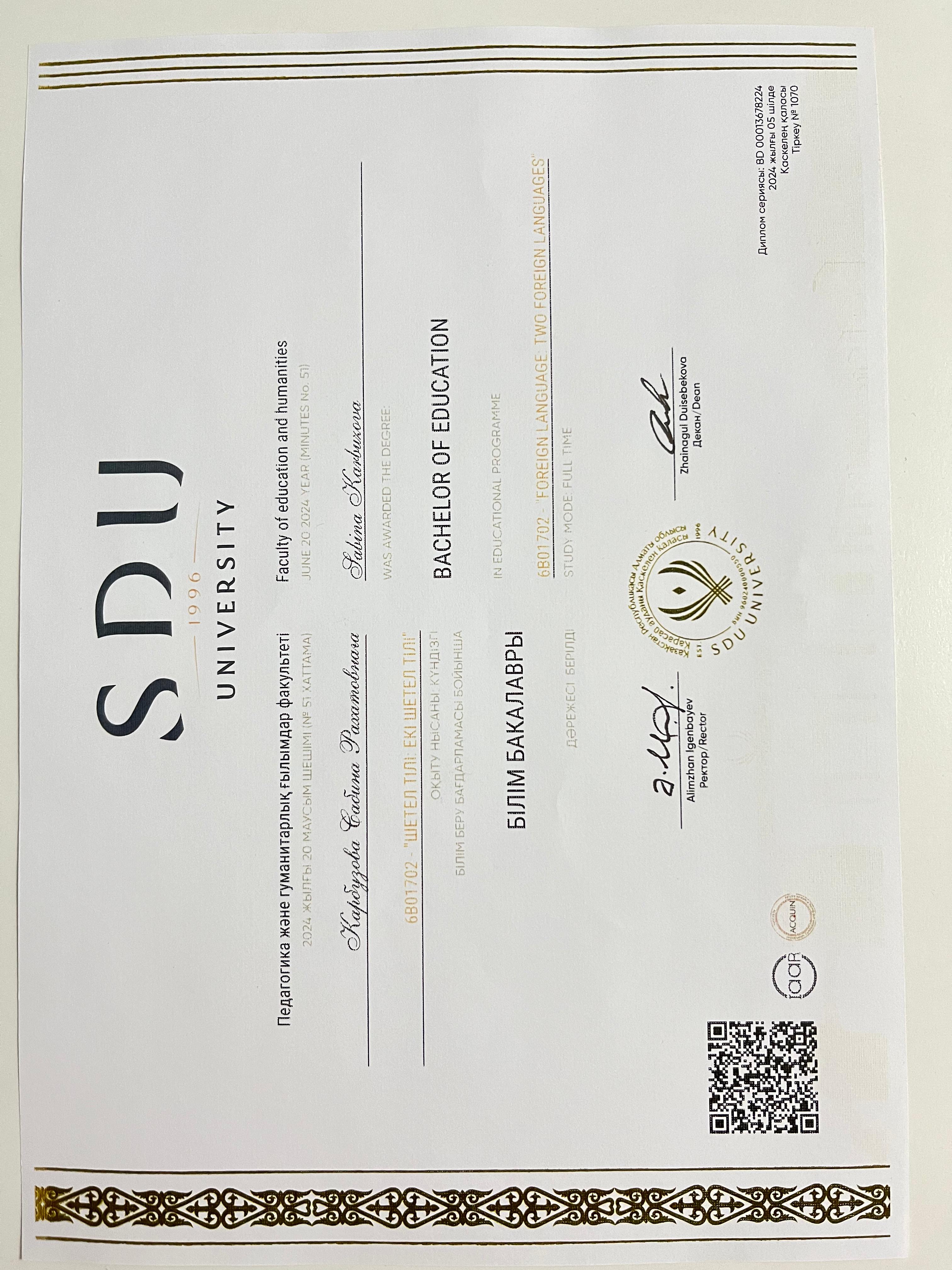 Сама обучалась в колледже ИНЯЗ и окончила университет SDU на педагога Английского языка✨