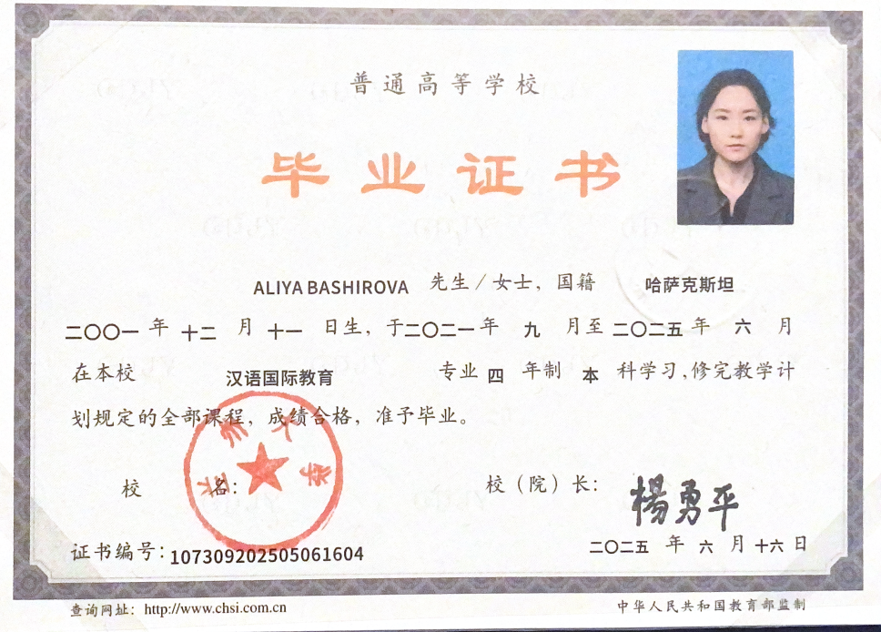 Высшее образование в педагогической сфере: бакалавр гуманитарных наук по направлению «Преподавание китайского как иностранного» (Lanzhou University, 2021–2025). Языковую подготовку посещала в 2019–2020 годах. Проходила практику в китайской младшей школе при университете. Общий опыт жизни в Китае — 2,5 года. Уровень языка на данный момент HSK 6.