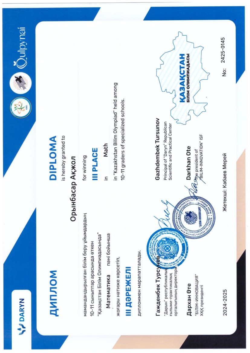 Студент 1-го курса Nazarbayev University (Computer Science). Выпускник спецлицея №39 (Алматы). Обладатель «Алтын белгі» и серебряный призер международных олимпиад (Туймаада, IGO). Мой результат NUET Math — 120/120 (максимум). Благодаря олимпиадному опыту, я глубоко понимаю математику и умею объяснять даже самые сложные темы (включая олимпиадную геометрию) простым языком. Моя цель — не просто натаскать на тесты, а научить понимать логику решения задач. Легко нахожу общий язык со школьниками, так как сам недавно прошел через все экзамены (SAT, NUET, ЕНТ, Госэкзамены).