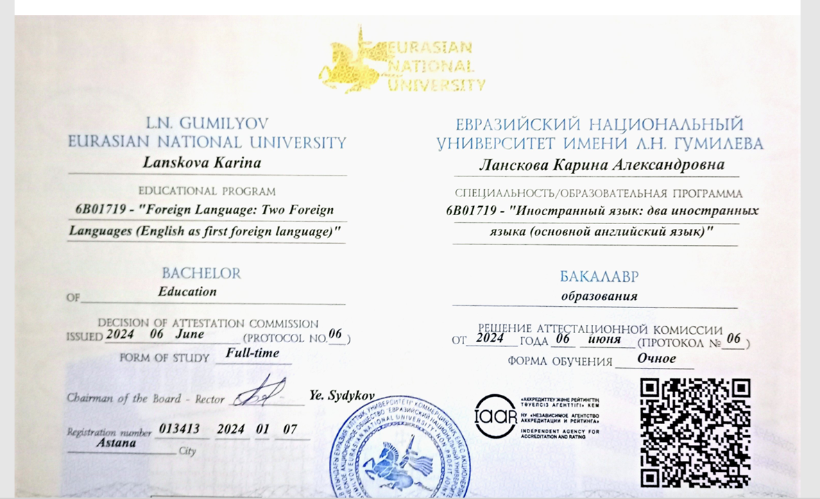 Я - репетитор английского языка с опытом преподавания более 3 лет. Окончила L.N. Gumilyov Eurasian National University по специальности подготовка учителей английского языка и получила красный диплом. Так же сдала IELTS 8.0