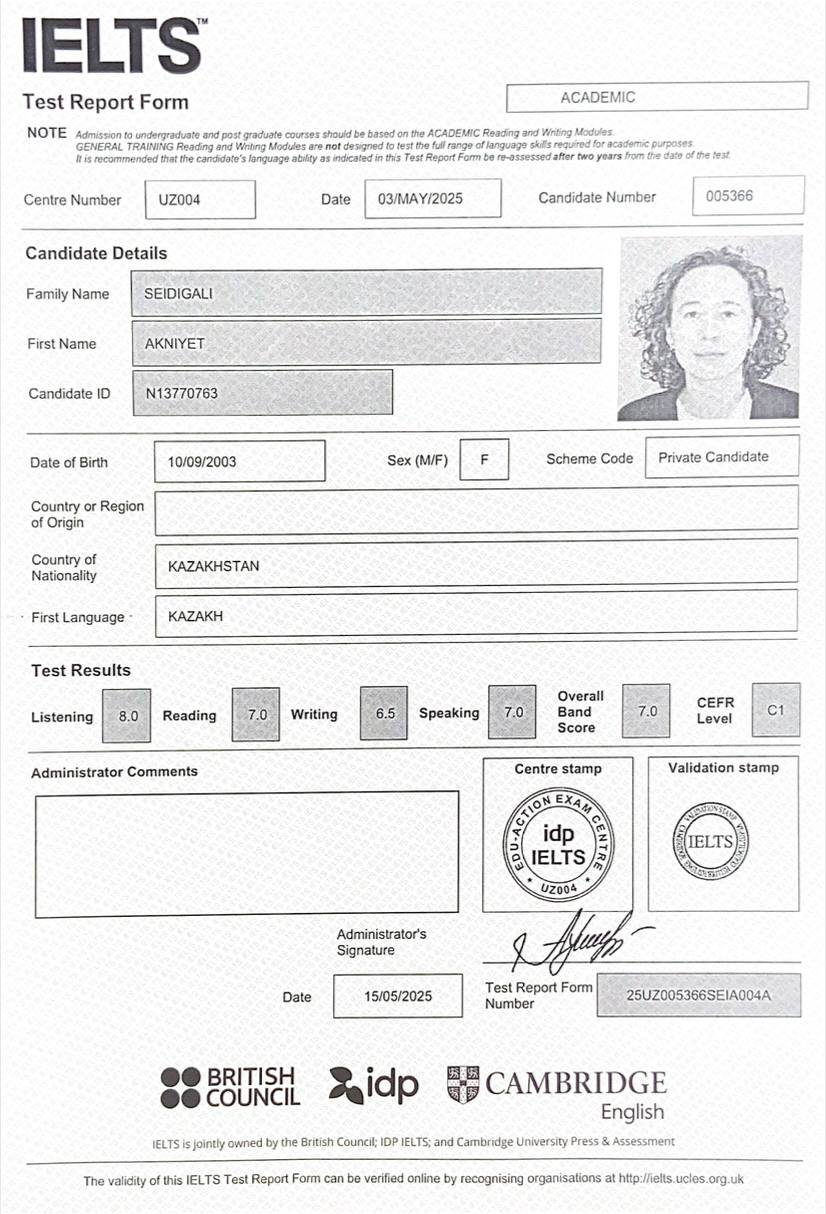 На занятиях делаю упор на практику и комфорт ученика. Есть опыт частных уроков с детьми: обучала через мультфильмы, игры и базовую грамматику. Работаю со школьной программой (5–11 классы), помогаю с домашними заданиями и разговорной речью. Проходила курсы IELTS и понимаю структуру экзамена, могу готовить до уровня B2. Также помогу с подготовкой к ЕНТ. Со мной легко — объясняю просто и понятно.