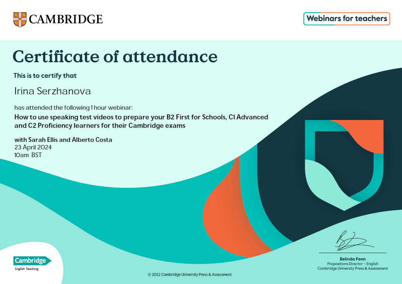 2024 How to use speaking test videos to prepare your B2 First for Schools, C1 Advanced and C2 Proficiency learners for their Cambridge exams, 1-hour webinar (“Как использовать видеоматериалы по тестированию разговорных навыков для подготовки к Кембриджским экзаменам B2 First for Schools, C1 Advanced и C2 Proficiency”).
